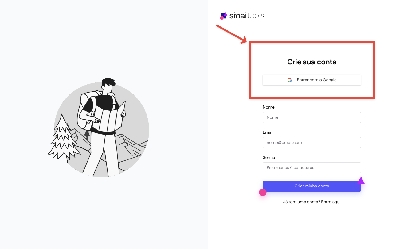 Você pode criar sua conta na Sinai Tools usando seu login do Google. Isso economiza tempo e elimina a necessidade de memorizar mais uma senha.